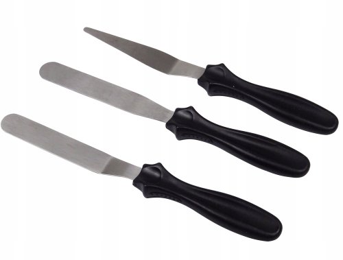 Zestaw zawiera trzy różne szpatułki: jedną prostą oraz dwie wygięte, co pozwala na dostosowanie narzędzia do różnych technik dekoracyjnych. Dzięki temu, każdy miłośnik cukiernictwa znajdzie idealne rozwiązanie dla swoich potrzeb.