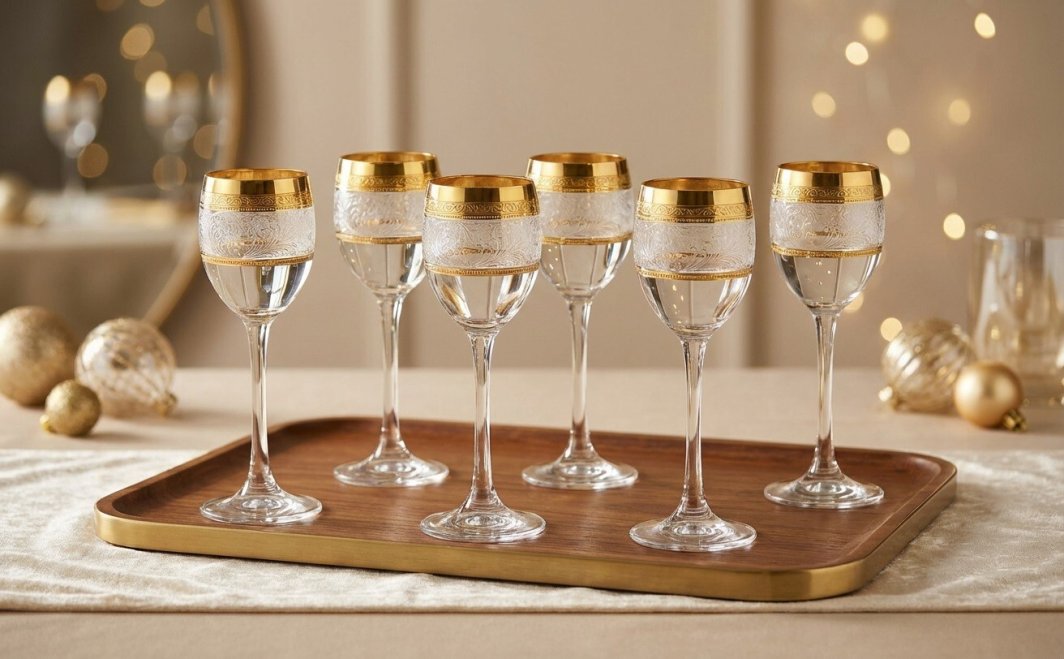 Dekoracja została wykonana w zakładzie Combi w Opolu metodą trawienia w szkle, a następnie ręcznie wykończona złotem. Złote obręcze nadają kieliszkom elegancką, reprezentacyjną linię i pięknie odbijają światło, podkreślając przejrzystość szkła. Dodatkowym elementem ozdobnym są delikatne szlify na ściankach, wyczuwalne pod palcami. Tworzą subtelny, falujący ornament przypominający delikatne pióra lub roślinne motywy, co dodaje kieliszkom głębi oraz wyjątkowego charakteru. Po nalaniu trunku dekoracja tworzy efektowne refleksy i podkreśla barwę likieru.