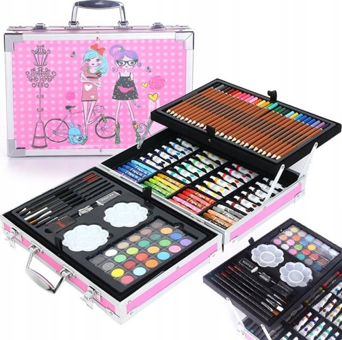 Różowa walizka, w której znajduje się zestaw, jest nie tylko atrakcyjna wizualnie, ale także bardzo praktyczna. Jej wymiary wynoszą 34 cm x 23 cm x 8,4 cm, a solidne zamki gwarantują bezpieczeństwo przechowywanych przyborów. Uchwyt ułatwia transport, co sprawia, że jest to idealne rozwiązanie do zabrania do szkoły, przedszkola, na zajęcia plastyczne czy wycieczki.