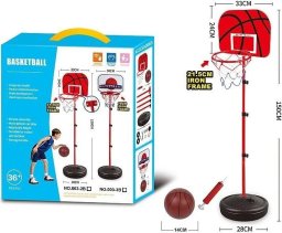 Zestaw wyposażony jest w kosz z regulowanym stojakiem, co pozwala na dostosowanie wysokości do potrzeb użytkowników w różnym wieku. Dzięki temu dzieci mogą cieszyć się grą, niezależnie od ich wzrostu.