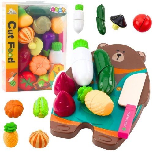 Zestaw do krojenia warzyw to idealna zabawka dla dzieci, które uwielbiają zabawy w kuchnię i naśladowanie dorosłych. W komplecie znajdują się kolorowe warzywa wykonane z wysokiej jakości tworzywa, bezpieczny nożyk oraz deska do krojenia w kształcie misia. Każde warzywo składa się z dwóch połówek połączonych rzepem, dzięki czemu można je kroić i łączyć ponownie wiele razy.