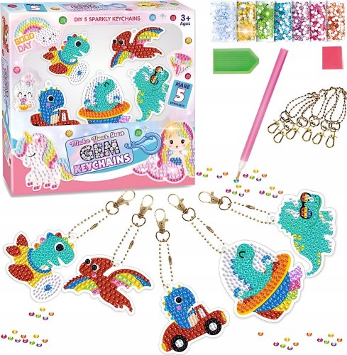 Dzięki różnorodnym elementom, dzieci mają możliwość stworzenia pięknych i oryginalnych breloczków z motywem dinozaurów. Zestaw umożliwia wykreowanie aż 5 unikalnych ozdób, które będą świetnym dodatkiem do plecaków, torebek czy kluczy.