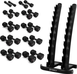 Stojak pomieści do 20 hantli, co pozwala na zachowanie porządku w strefie treningowej, a jego praktyczny design ułatwia dostęp do hantli podczas ćwiczeń.