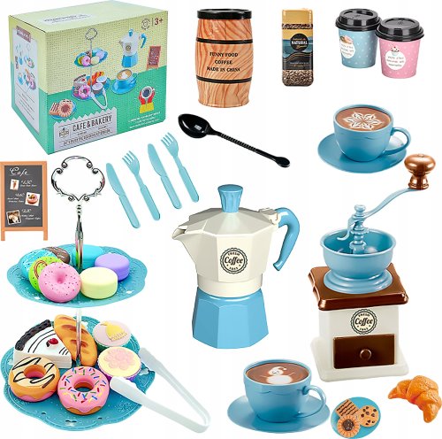 W skład zestawu wchodzą wszystkie niezbędne akcesoria do przygotowania idealnej kawy oraz słodkiego poczęstunku. Dzieci będą mogły korzystać z kawiarki, młynka do mielenia kawy, filiżanek z podstawkami, a także pysznych słodyczy, takich jak rogalik, donuty i ciasteczka. Dzięki temu zestawowi, każde dziecko poczuje się jak prawdziwy barista, a zabawa w kawiarnię stanie się jeszcze bardziej ekscytująca.