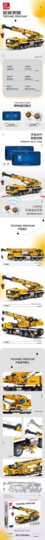 | Zestaw 1901 klocków konstrukcyjnych do samodzielnego złożenia pojazdu budowlanego dźwigu do zdalnego sterowania. Zabawka przeznaczona dla dzieci od 14-go roku życia. Dźwig posiada wiele ruchomych elementów, jak kabina obracająca się o 360 stopni. Dodatkowo, można manualnie ruszać ramieniem dźwigu w płaszczyznach góra-dół i przód-tył, za pomocą specjalnych zębatek.