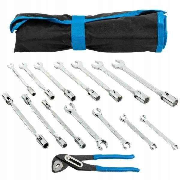 Zestaw kluczy płasko-nasadowych, nasadowo przegubowych, oczkowych rozciętych 14el. (8-19mm) na płachcie + szczypce