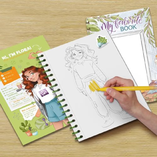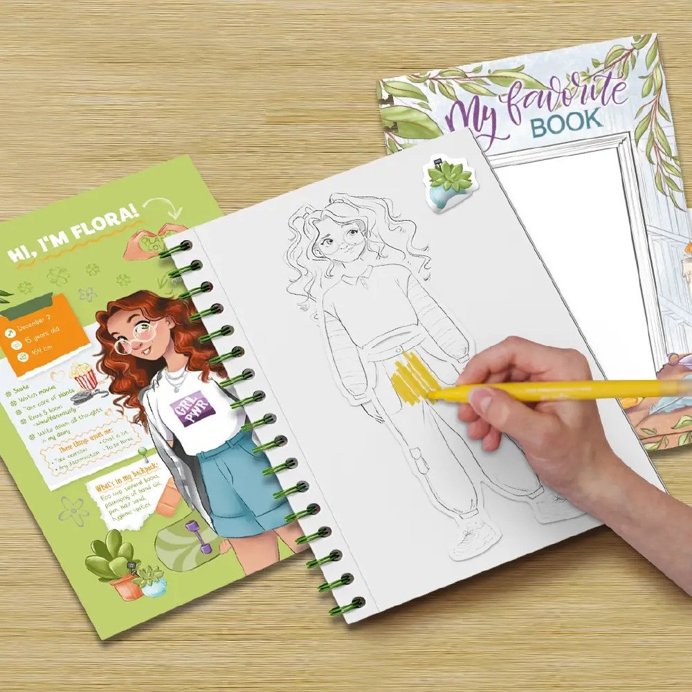 W zestawie znajduje się bloknot na spirali o wymiarach 17,6 x 25 cm, 10 dwustronnych markerów oraz różnorodne naklejki i zadania kreatywne. Te elementy inspirują dzieci do samodzielnego tworzenia rysunków oraz opowieści, rozwijając ich zdolności artystyczne.