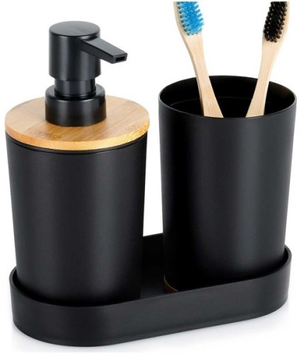 Zestaw łazienkowy 3-elementowy z dozownikiem, kubkiem i podstawką w matowym czarnym kolorze z dodatkiem bambusa. Ułatwia organizację przestrzeni.Praktyczny zestaw łazienkowy - Zestaw akcesoriów łazienkowych, składający się z: dozownika na mydło, kubka na przybory np. szczoteczki lub pastę oraz podstawki. Zestaw ustawiony na podstawce ma wymiary 16,5 x 8,5 x 17,5 cm.Solidnie wykonany - Wykonany z najwyższej jakości tworzywa w czarnym, matowym kolorze. Dodatkowe elementy wykonane z drewna bambusowego.Przydatny w każdej łazience - Ułatwia organizację przestrzeni wokół umywalki, umożliwiając wygodne przechowywanie szczoteczek i mydła. Praktyczne rozwiązanie, które pomaga utrzymać porządek.Funkcjonalny i kompaktowy - Wszystkie elementy umieszczone są na podstawce, co pozwala zachować porządek na umywalce i zaoszczędzić miejsce.Stylowy dodatek do łazienki - Nowoczesne połączenie czerni z drewnem bambusowym sprawia, że zestaw będzie estetycznym i praktycznym elementem wyposażenia każdej łazienki.Komplet akcesoriów łazienkowych. W zestawie: 1x dozownik na mydło (8 x 8 x 17 cm, pojemność 380 ml), 1x kubek na przybory (8 x 8 x 11,5 cm, pojemność 400 ml), 1x podstawka (16,5 x 8,5 cm). Przydatne w każdym domu. Solidnie wykonane będą stanowić wyjątkowy element dekoracyjny. Akcesoria prezentują się bardzo elegancko i są utrzymane w modnej kolorystyce. Klasyczny kształt sprawia, że pasują do każdego wnętrza. Oryginalny produkt marki Vilde. Wyprodukowano zgodnie z europejskimi standardami.