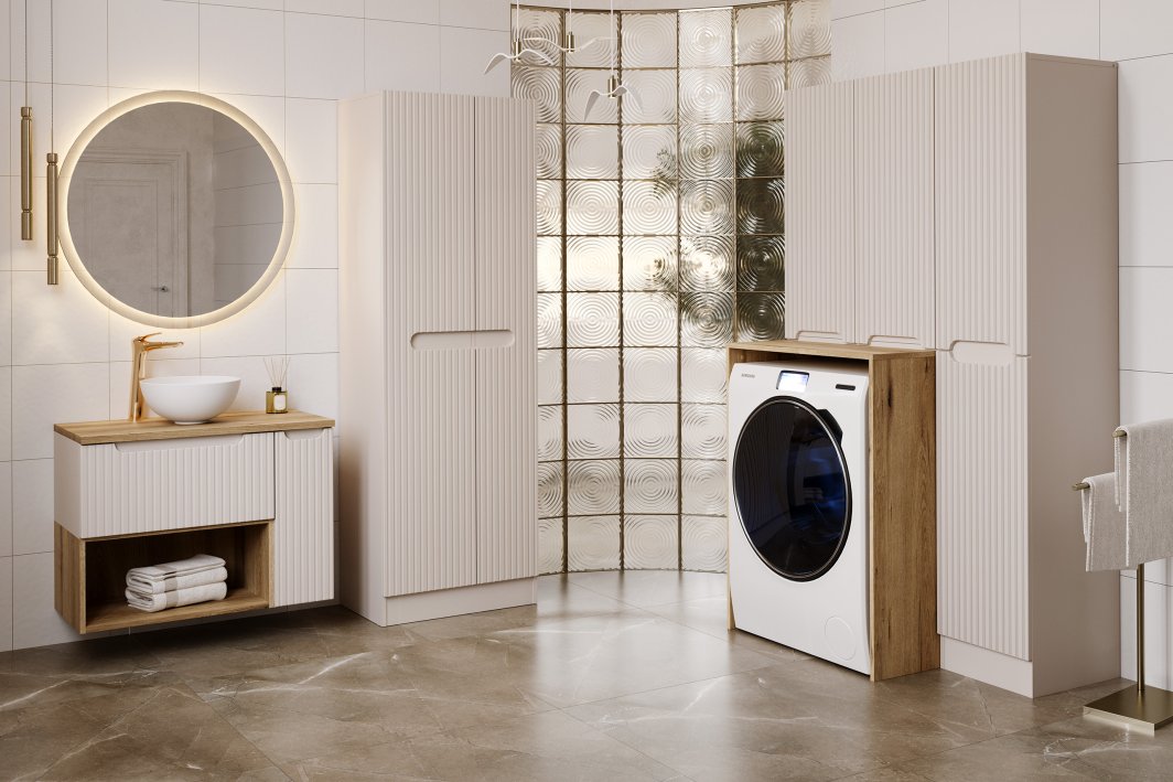 Ten zestaw meblowy to idealne rozwiązanie dla osób, które cenią porządek i estetykę w swoim domu. Obudowa na pralkę zapewnia schludne wykończenie, a wysokie szafki oferują wystarczająco dużo miejsca na przechowywanie detergentów oraz innych akcesoriów związanych z praniem.