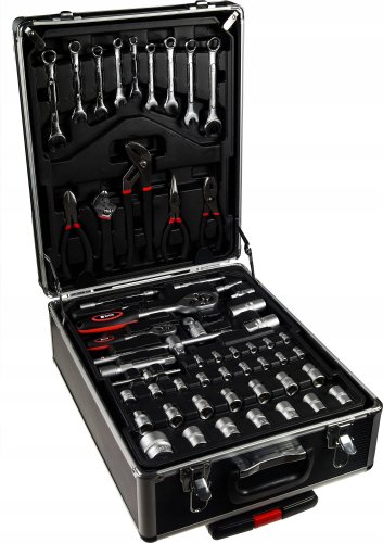 Zestaw narzędzi w metalowej walizce zamykanej na kluczyk. Wbudowane kółeczka ułatwiające przesuwanie walizki, oraz teleskopowa rączka. Doskonale wykonana walizka narzędziowa, Cały zestaw wykonany z zachowaniem solidnej jakości. Walizka aluminiowa z kółeczkami i rączką wyciąganą teleskopowo do przewożenia zestawu (jak walizka podróżna). Cztery wyciągane szuflady z narzędziami.