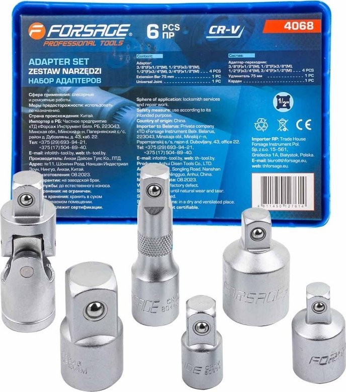 Adaptery zostały stworzone z wysokiej jakości stopu chromowo-wanadowego (CR-V), co zapewnia im długowieczność oraz odporność na zużycie. Dzięki temu zestaw narzędzi Forsage F-4068 jest nie tylko wytrzymały, ale także odporny na działanie różnych czynników, co czyni go idealnym wyborem do intensywnego użytkowania.
