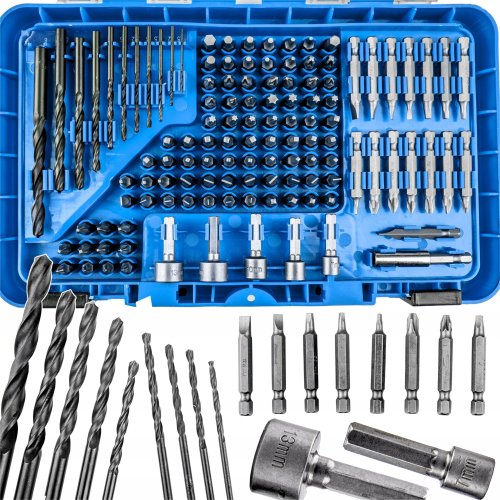 Zestaw zawiera bogaty wybór narzędzi, w tym wiertła do metalu o średnicach od 1,5 mm do 8 mm oraz bity w różnych typach, takich jak Philips, Pozidriv, Square, Torx i imbusowe. Długości bitów wynoszą 25 mm oraz 50 mm, co zapewnia wszechstronność i możliwość dostosowania do różnych zadań.