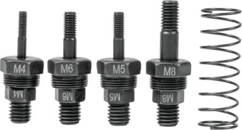 W skład zestawu wchodzą trzpienie oraz nasadki w popularnych rozmiarach M4, M5, M6 oraz M8. Dzięki temu użytkownicy mają dostęp do narzędzi, które doskonale pasują do różnych zastosowań, co zwiększa ich wszechstronność i użyteczność.