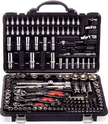 Zestaw kluczy nasadowych w walizce 150 części wykonanych ze stopu stali CR-V wytrzymałej na naprężenia statyczne i kinetyczne. Unikalna powłoka na powierzchni znacząco zwiększa komfort pracy oraz pozwala na utrzymanie narzędzi w czystości. Praktyczna i solidna walizka z tworzywa sztucznego z metalowymi zatrzaskami i poręcznym uchwytem.