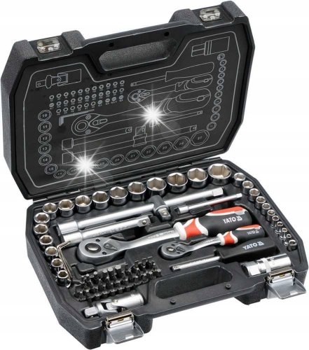 Zestaw YATO oferuje szeroki wachlarz narzędzi, w tym klucze nasadowe sześciokątne w różnych rozmiarach, przedłużki, klucze grzechotki oraz różnorodne końcówki. W skład zestawu wchodzą również klucze imbusowe w czterech rozmiarach, co czyni go niezwykle funkcjonalnym narzędziem do wielu zadań.