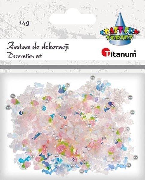 Zestaw perełki 4 mm, cekiny kwiatek płaski 10 mm, kwiatki wypukłe 2 wzory 10 mm, konfetti truskawka 5 x 7 mm, czereśnie 10 x 9 mm, nuta 6 x 9 mm, łabędź 6 x 8 mm, cukierek 8 x 3 mm, owca 12 x 11 mm, avocado dwustronne 5 x 6, 6 x 8 mm 14 g tonacja różowa.