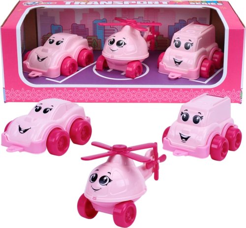 Zestaw Różowych Samochodów Pojazdy Mini Helikopter Minibus Urocze Buźki