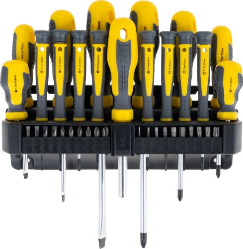Magnetyczne końcówkiErgonomiczna rękojeśćWykonane ze stali chromowo-wanadowejPlastikowy stojakW zestawie:Płaskie1,2 x 6,5 x 38 mm1,0 x 5,5 x 75 mm1,2 x 6,5 x 100 mm1,2 x 8,0 x 150 mmGwiazdkowe2 x 38 mm1 x 75 mm2 x 100 mm3 x 150 mmPrecyzyjnePłaski 0,4 x 2,0 x 50 mmPłaski 0,4 x 2,5 x 50 mmPłaski 0,5 x 3,0 x 50 mmGwiazdkowy 00 x 50 mmGwiazdkowy 0 x 50 mmTorx T6 x 50 mmTorx T8 x 50 mmTorx T10 x 50 mmNasadkiSześciokątne x6Torx x4Płaski x4Gwiazdkowy x6Uchwyt do nasadek x1
