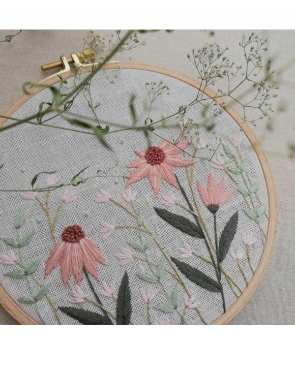 Zestaw startowy do nauki haftu płaskiego - "Łąka z jeżówkami". W stworzeniu haftu pomoże Ci wzór i instrukcja, nie musisz umieć haftować, aby wykonać wzór z zestawu. Wszystko jest wyjaśnione krok po kroku w instrukcji.