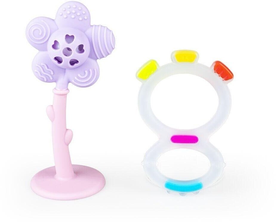 W skład zestawu wchodzi gryzak w kształcie ósemki oraz grzechotka w formie kwiatu. Obie zabawki zostały zaprojektowane z myślą o bezpieczeństwie dzieci, co czyni je idealnymi towarzyszami zabaw. Gryzak doskonale łagodzi ból związany z ząbkowaniem, a grzechotka stymuluje zmysły malucha.