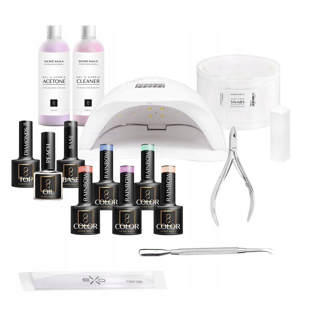 Zestaw startowy hybryd OCHO NAILS to znakomity wybór zarówno dla doświadczonych stylistek paznokci, jak i dla tych, którzy dopiero rozpoczynają swoją przygodę z manicure. Dzięki temu zestawowi stworzysz piękne i trwałe stylizacje w komfortowych warunkach swojego domu lub w profesjonalnym salonie kosmetycznym.