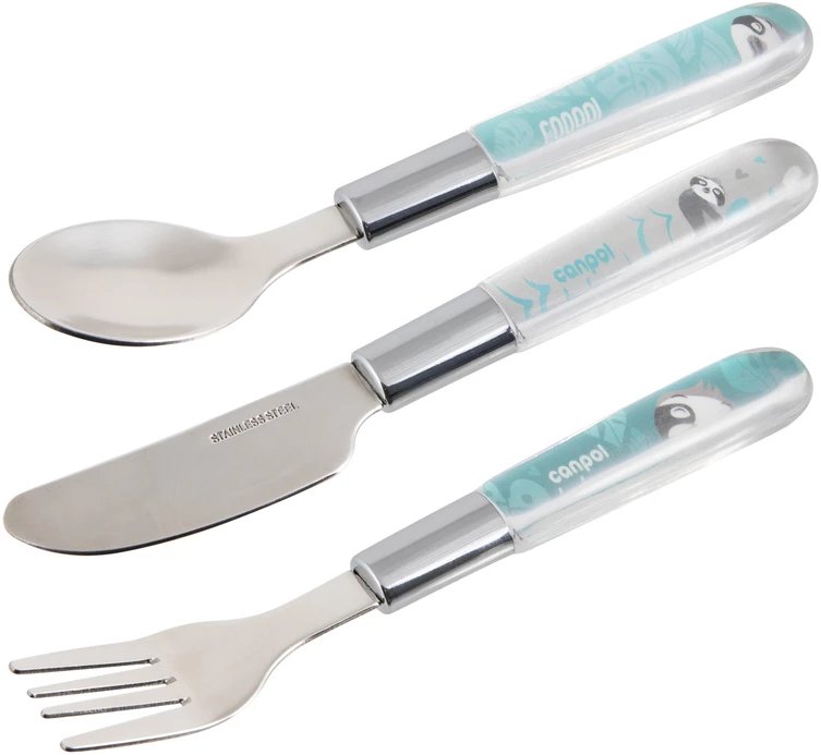 W skład zestawu wchodzą: nóż, łyżeczka oraz widelec, co czyni go kompletnym wyposażeniem dla każdego małego smakosza. Dzięki temu, każde dziecko ma wszystko, co potrzebne do nauki jedzenia w jednym zestawie.