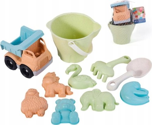 Jest to zestaw przeznaczony do zabawy na plaży, który zawiera elementy wykonane z ekologicznych i biodegradowalnych materiałów.