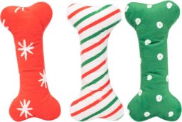 Świąteczne, pluszowe zabawki w kształcie kości dla psów, z motywem świątecznym.