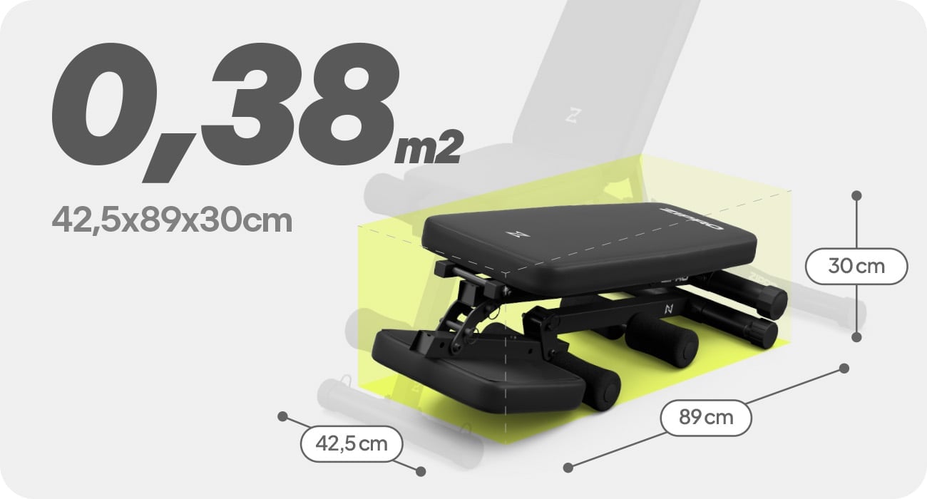 Po złożeniu wymiary ławki zaledwie 89 x 43 x 30 cm. To wystarczająco mało, by bez trudu zmieścić ją nawet w mniejszym schowku czy szafce.