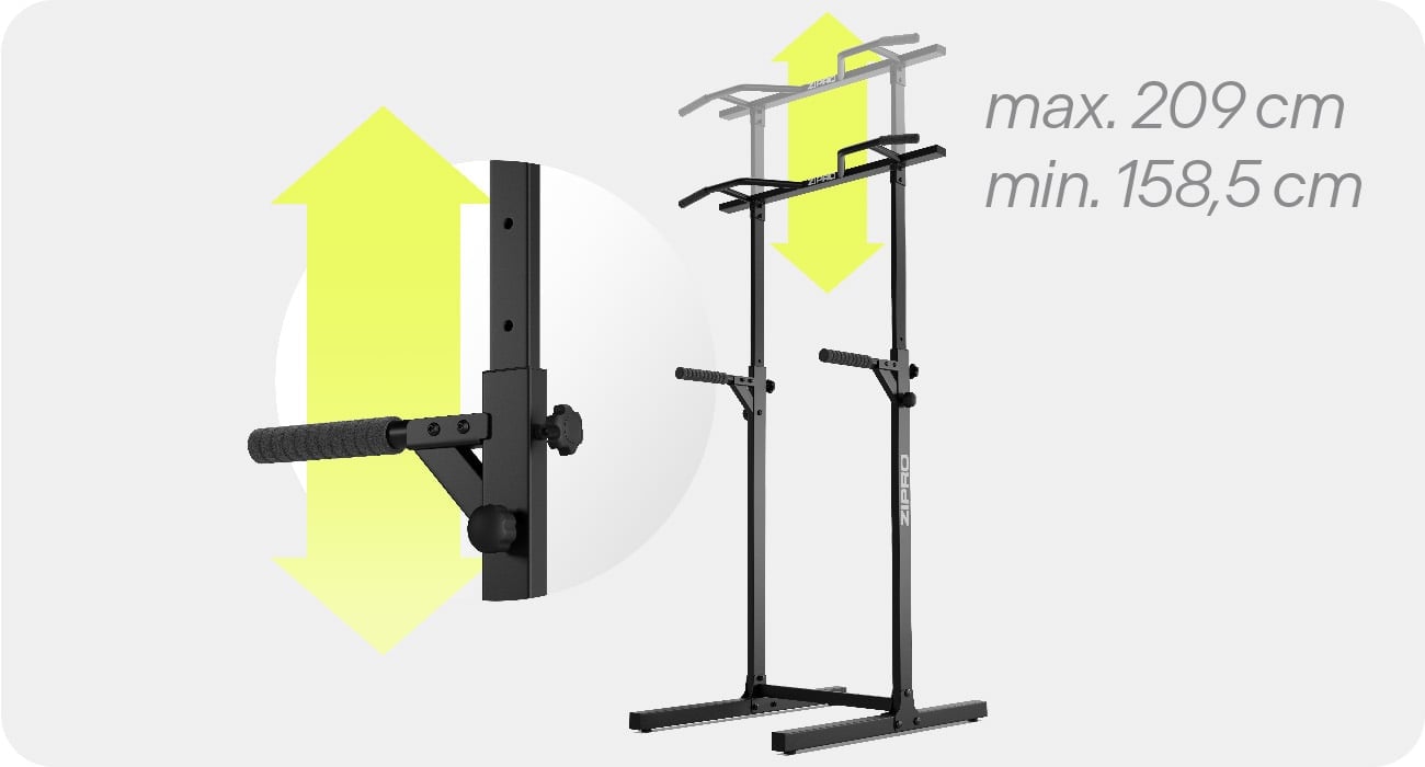 Drążek do podciągania z regulacją wysokości od 158,5 do 209 cm pozwala idealnie dopasować sprzęt do wzrostu. Szeroki uchwyt 94,5 cm z piankowymi rączkami (Ø3 cm) zapewnia pewny chwyt, a dodatkowa opcja poręczy do dipów (wys. 98 cm, Ø4 cm) poszerza zakres ćwiczeń. Stabilna podstawa 96×64 cm i maksymalna waga użytkownika 120 kg umożliwiają bezpieczny i komfortowy trening.