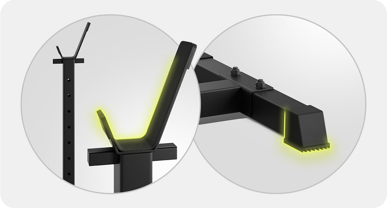 Zabezpieczenia nóg chronią podłoże przed uszkodzeniami.Cała konstrukcja została zaprojektowana tak, aby trening był wygodny, stabilny i bezpieczny nawet przy dużych obciążeniach.