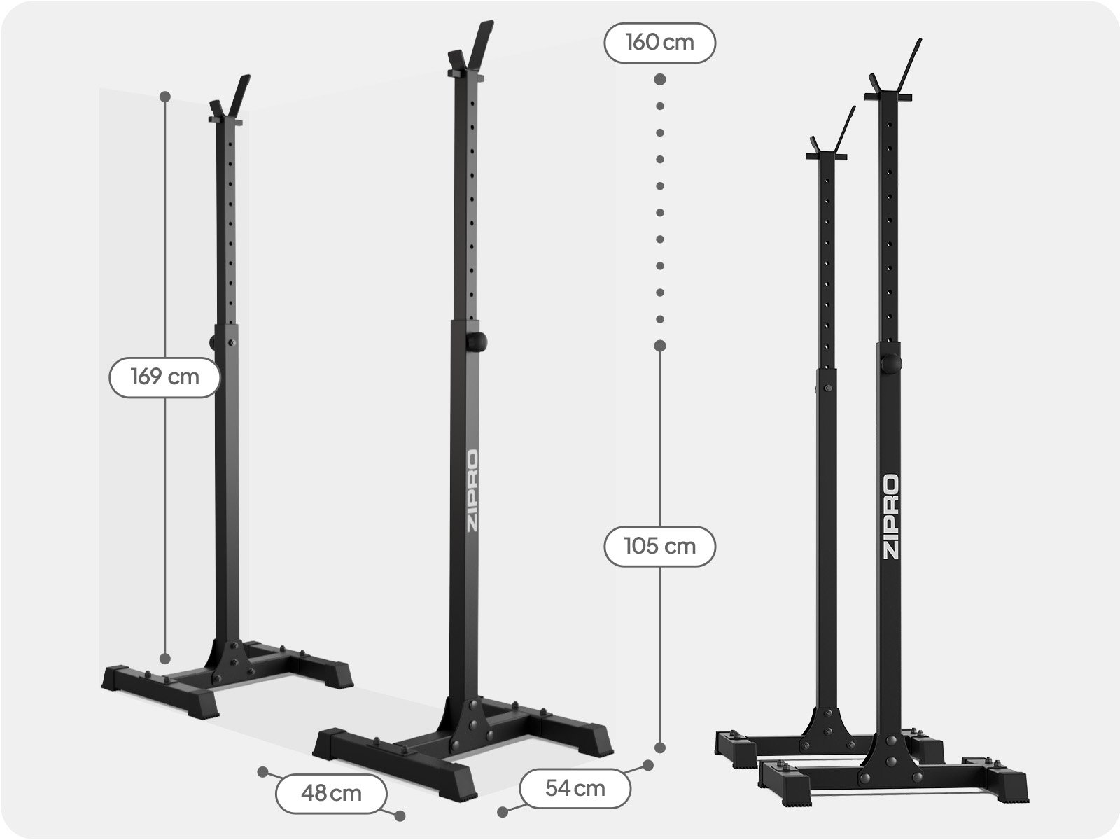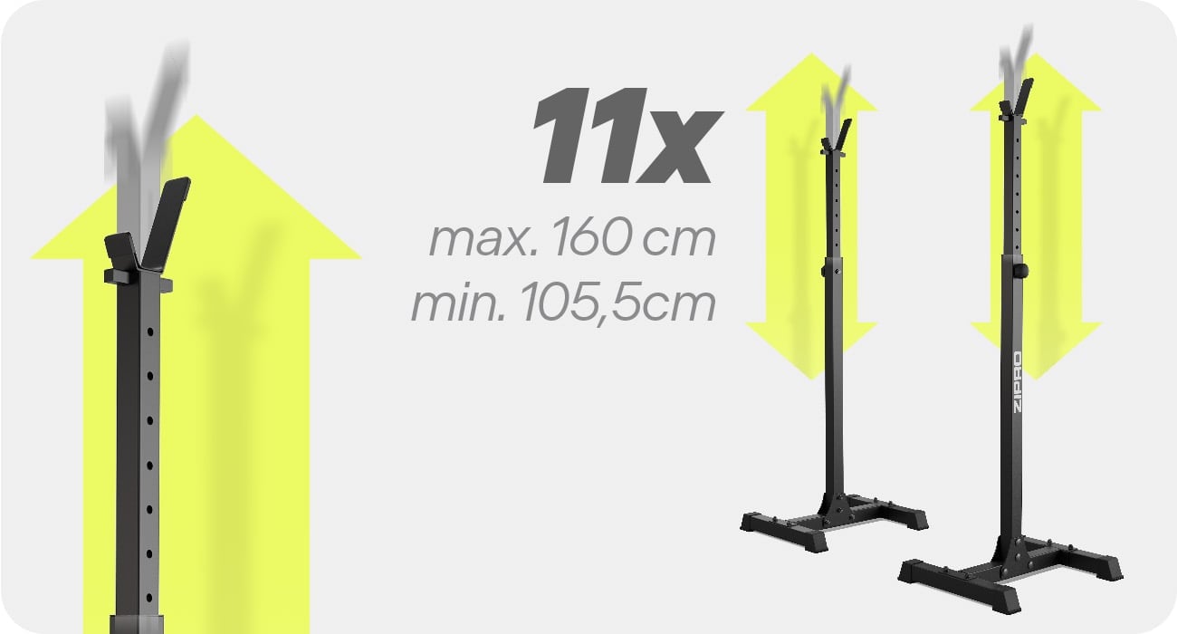 Stojaki oferują 11 stopniową regulację wysokości, dzięki czemu dopasujesz je do swojego wzrostu, rodzaju ćwiczeń i używanej sztangi. Regulacja jest szybka i intuicyjna, a stabilne blokady utrzymują wybrane ustawienie.