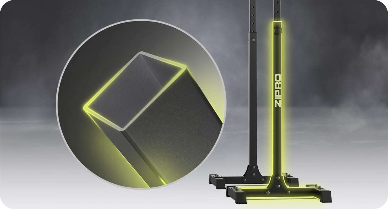 Słupki i podstawa wykonane ze stalowych profili 50×50 mm zapewniają wysoką sztywność i trwałość. To stabilna podstawa, która sprawdzi się przy intensywnych ćwiczeniach w warunkach domowych.