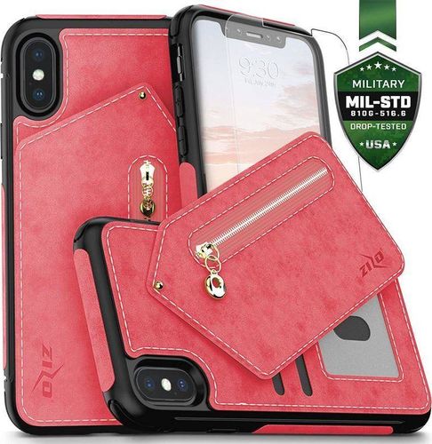 Zizo Zizo Nebula Wallet Case - Skórzane etui iPhone X z kieszeniami na karty + saszetka na zamek + szkło 9H na ekran (Pink/Black)
