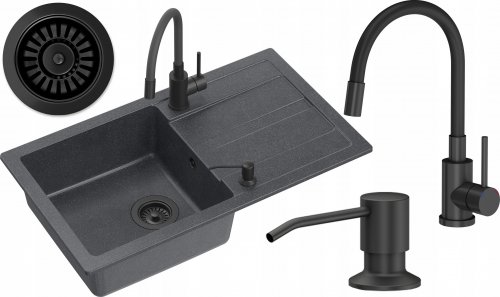 Zlewozmywak GraniteQ READY- MAX CZARNY zlewozmywak granitowy 1-k z/o (77x44x17,5) + bateria z elastyczną wylewką very black + dozownik very black + syfon very black