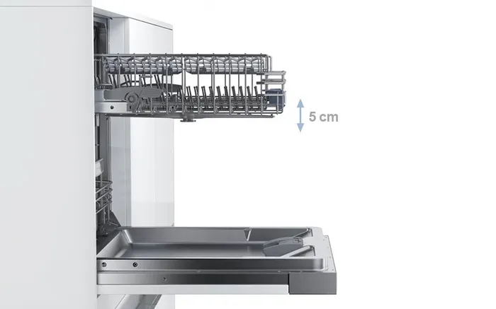 Dzięki systemowi Rackmatic wysokość górnego kosza można łatwo wyregulować jednym ruchem ręki. Mechanizm ten pozwala na zmianę położenia kosza o łącznie 5 cm w trzech stopniach – i to nawet wtedy, gdy jest on w pełni załadowany naczyniami.