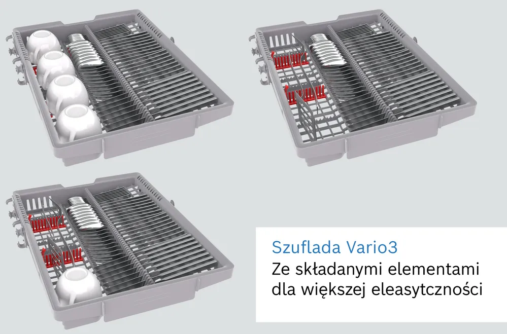 Jeśli nie masz kluczowego składnika, zmieniasz swoje menu. Czy Twoja zmywarka Slimline może równie elastycznie reagować na różne wyzwania? Kosze VarioFlex i szuflada Vario3 mogą, dzięki wszechstronnej szufladzie na sztućce w połączeniu z górnym koszem o regulowanej wysokości. Dostosuj przestrzeń do swoich potrzeb dzięki 6 składanym przegrodom, 2 półkom na filiżanki, 2 elementom antypoślizgowym i podpórce na kieliszki. Chwyć więc za eleganckie uchwyty kosza i wyciągnij więcej opcji załadunku.
