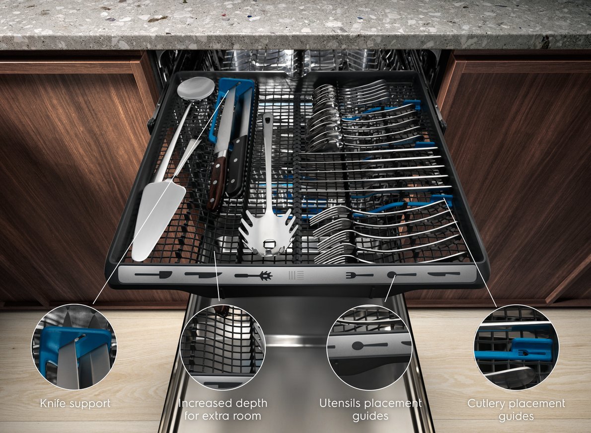 Szufladę MaxiFlex została zaprojektowana w taki sposób, aby mogła pomieścić sztućce i przybory kuchenne w różnych kształtach i rozmiarach. Ruchome przegródki i głęboka szuflada pozwolą Ci łatwo załadować je do zmywarki niezależnie od ich wielkości i kształtu.