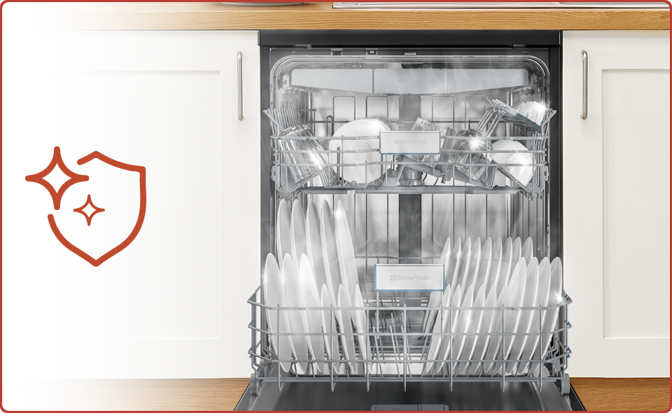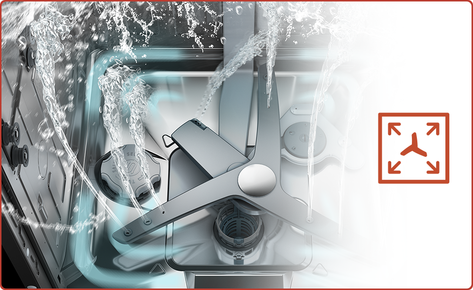 Standardowe zmywarki mają tylko jedno obrotowe ramię, dlatego czasami trzeba samemu doszczyścić resztki na naczyniach po zakończonym cyklu zmywania. Pozbyliśmy się tego problemu dzięki innowacyjnej technologii CornerWash z ramieniem z trzema strumieniami wody, która dociera do każdego zakątka zmywarki. Zaufaj nam, gdy mówimy, że trzy ramiona natryskowe to zdecydowanie lepsze rozwiązanie niż jedno! Dzięki nim każde naczynie jest tak czyste, jak to tylko możliwe.