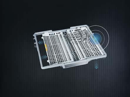 Ulepszyliśmy szufladę na sztućce: teraz możesz umieścić w niej również mniejsze naczynia, jak filiżanki do espresso. Szuflada 3D MultiFlex1 składa się z opuszczanych części bocznych i środkowej. Lewą można przesunąć w prawo, aby w górnym koszu zrobić miejsce na wysokie kieliszki do wina. W opuszczanej prawej części można umieścić wygodnie duże sztućce i małe naczynia.