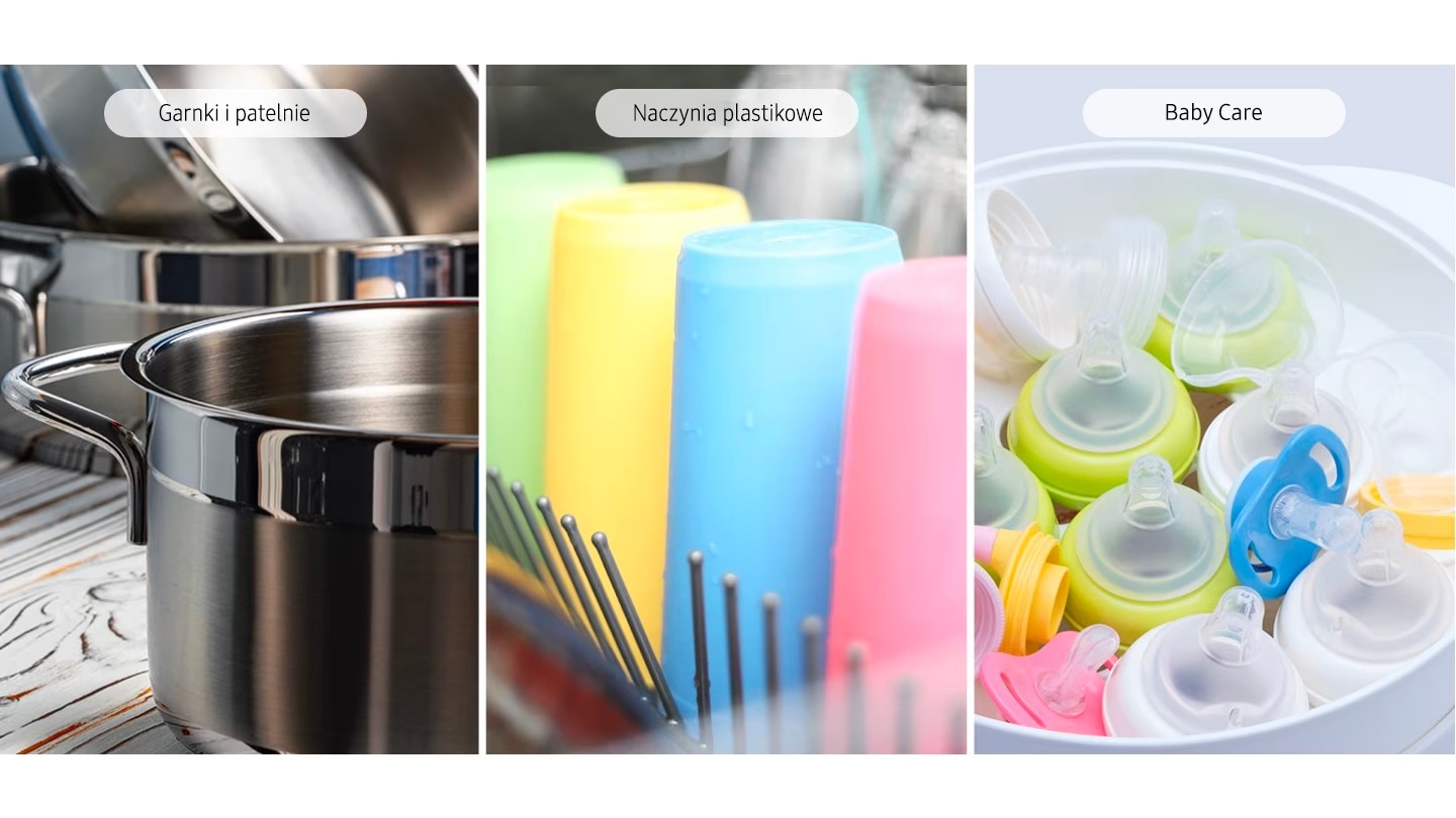 Pozwala wybrać jeden z 3 dodatkowych programów i natychmiast pobrać ten, który chcesz za pomocą smartfona w aplikacji. Możesz wybrać następujące programy: "Garnki i patelnie", "Naczynia plastikowe" lub "Baby Care".