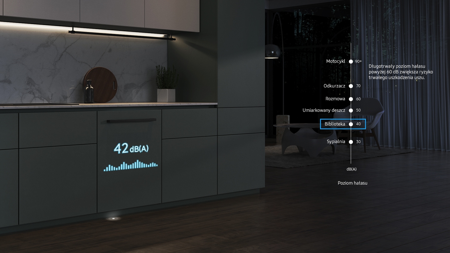 Ograniczenie hałasu w domu. Zmywarka pracuje cicho za sprawą wbudowanego energooszczędnego silnika który redukuje hałas wydawany przez urządzenie podczas pracy. Program wydłuża nieco cykl mycia jednak redukuje przy tym hałas o 2 decybele w stosunku do klasycznego trybu eco. Hałas generowany przez zmywarkę w trybie Extra Cichym to 40 dBA i jest w odczuciu nawet mniejszy niż w bibliotece.