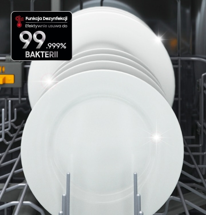 Dzięki funkcji dezynfekcji skutecznie oczyścisz m.in. butelkę czy kubeczek niemowlaka. Woda w urządzeniu podgrzewana jest do 70°C, co pozwala na skuteczną eliminację bakterii i wirusów, które mogły osiąść na naczyniach. Usuwa 99.999% bakterii i zarazków sprawiając, że umyte naczynia będą perfekcyjnie czyste.