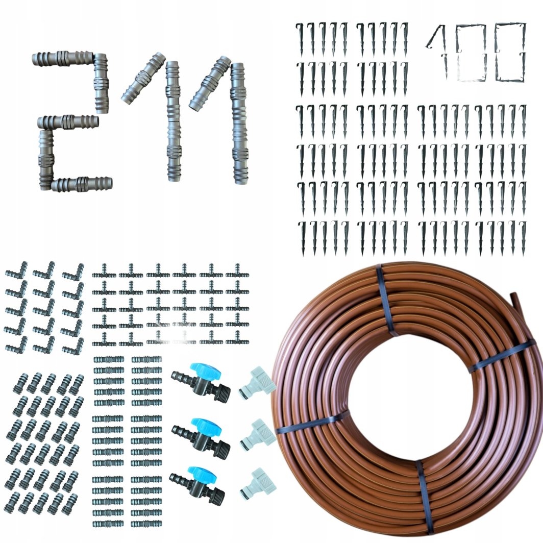Zestaw zawiera 100 szpilek do mocowania linii kroplącej, które są odporne na różne warunki atmosferyczne. Dzięki nim, instalacja pozostaje stabilna i dobrze zamocowana, co jest kluczowe dla efektywności całego systemu nawadniania.